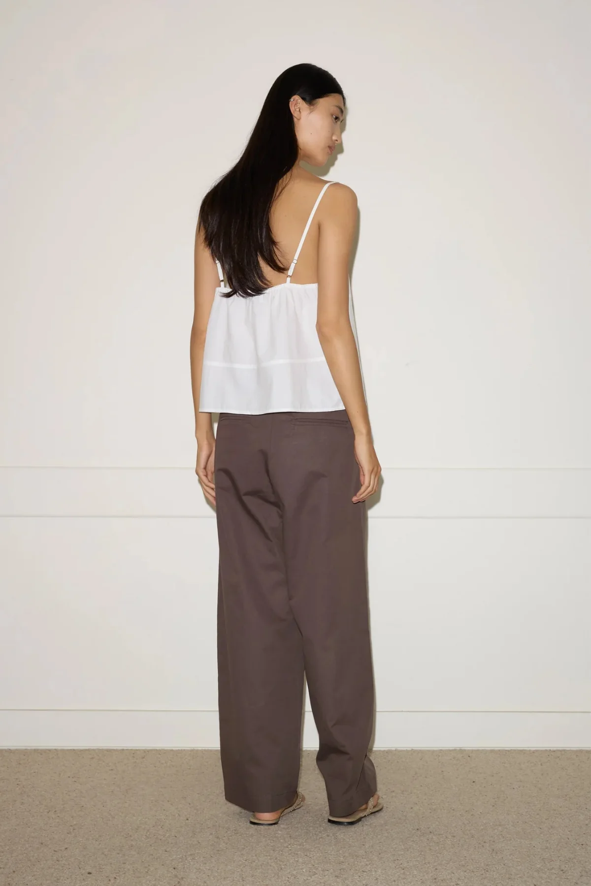 The seam top by Deiji Studios in white. A soft structured top with fixed fine straps and a subtle flared silhouette. features a button front opening, slight bust gathers and adjustable straps.